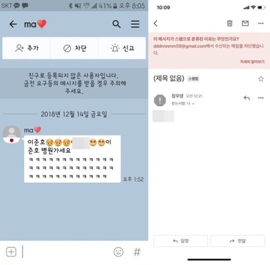 人民網訊 4日,2PM成員玉澤演在個人SNS上公開了一組截圖,截圖中包含“李俊昊去醫院吧”“我知道哥哥的電話號碼和地址”等信息,還有對2PM成員們的辱罵和威脅內容,令人毛骨悚然。