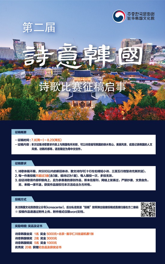 第二屆“詩意韓國”詩歌比賽活動將繼續本著促進韓中文化交流發展的宗旨,秉承公平公正的原則,歡迎廣大詩歌愛好者踴躍投稿。具體征稿要求、投稿方式等,可登錄駐華韓國文化院官方主頁(http://c.kocenter.cn/www/index.jsp)及微信公眾號(koreacenter)查詢。