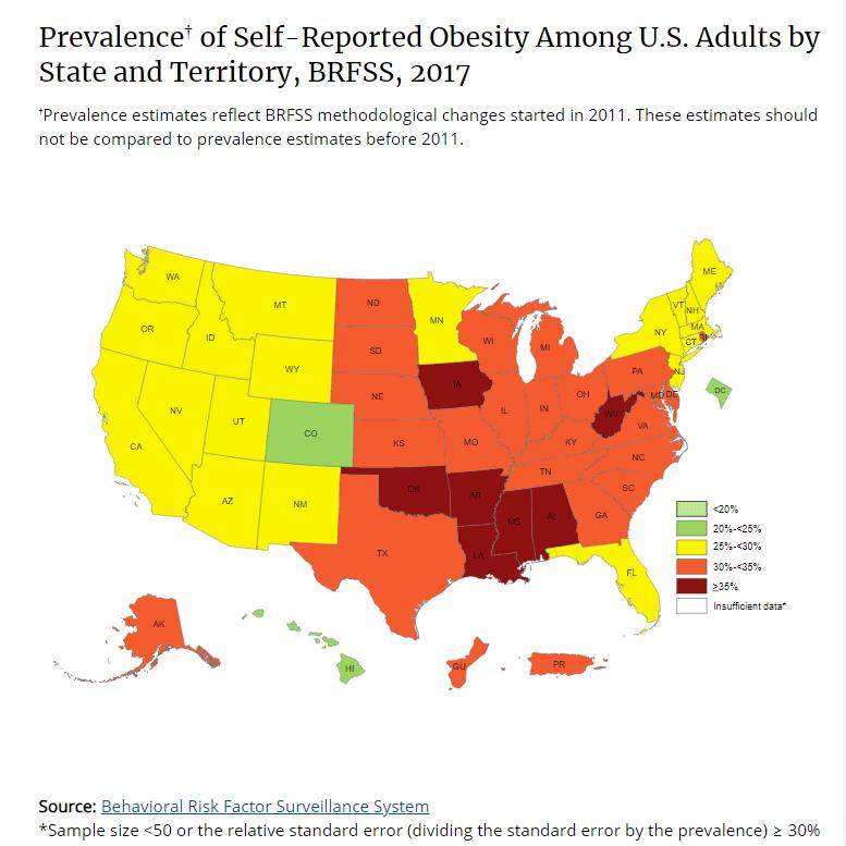 缺乏運動,肥胖隨之而來。在美國,肥胖是一個普遍,且急需解決的健康問題。美國疾病控制和預防中心下屬的國家衛生統計中心報告顯示,超過三分之一(39.6%)20歲以上的美國成年人和17%的2-19歲的兒童和青少年肥胖。報告預測,到2030年,美國所有成年人中有一半會肥胖。世界衛生組織指出超重和肥胖是全球引起死亡的第五大風險,全球每年“胖死”的人至少280萬。