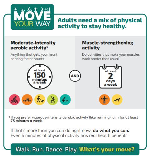 《指南》建議成人每周至少進行150分鐘的中度或75分鐘的劇烈有氧運動,如跑步或游泳等;此外每周進行至少兩天的肌肉強化活動,如舉重或俯臥撐等。
