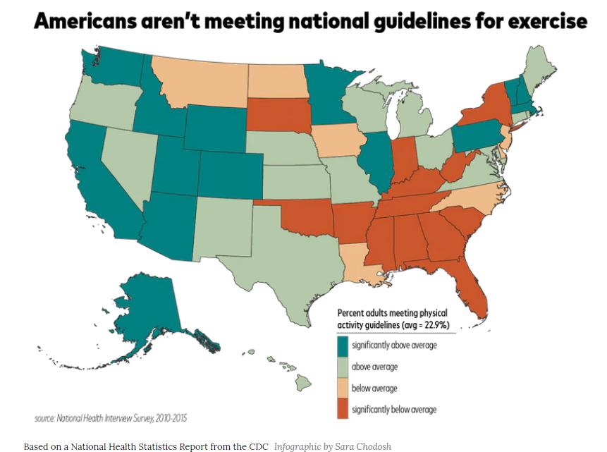 這種地理上出現的差異與社會經濟地位相關,健身活躍的州通常收入較高,不需要體力勞動,并且工作時間更短,更有規律。