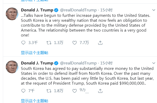當地時間7日,特朗普在推特上表示,韓國已經同意向美國支付更多的錢,以防御朝鮮。過去幾十年里,韓國(在防務方面)支付給美國的錢很少,但在他本人的要求下,韓國去年支付了9.9億美元。