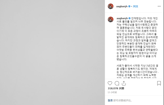 最后,安宰賢向受到二人離婚影響的經紀公司、《我家的熊孩子》節目組,以及電視劇拍攝現場工作人員表示歉意,“都是因為我的不足,沒能整理好我的個人事務而發生的事情,我真心向大家道歉,對不起”。