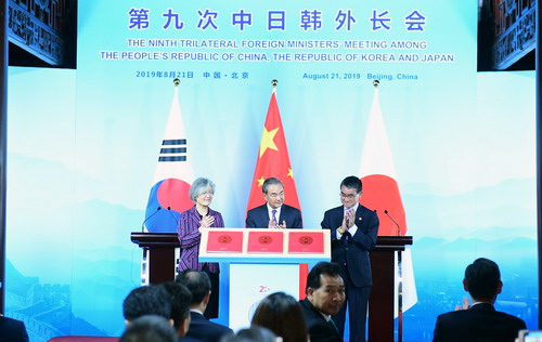 人民網北京8月22日電(劉葉婷)共話務實合作,聚焦未來發展。21日,第九次中日韓外長會議在北京舉行。國務委員兼外交部長王毅主持會議,韓國外長康京和、日本外相河野太郎出席。三國外長就中日韓合作、籌備第八次中日韓領導人會議及共同關心的國際地區問題交換了意見。