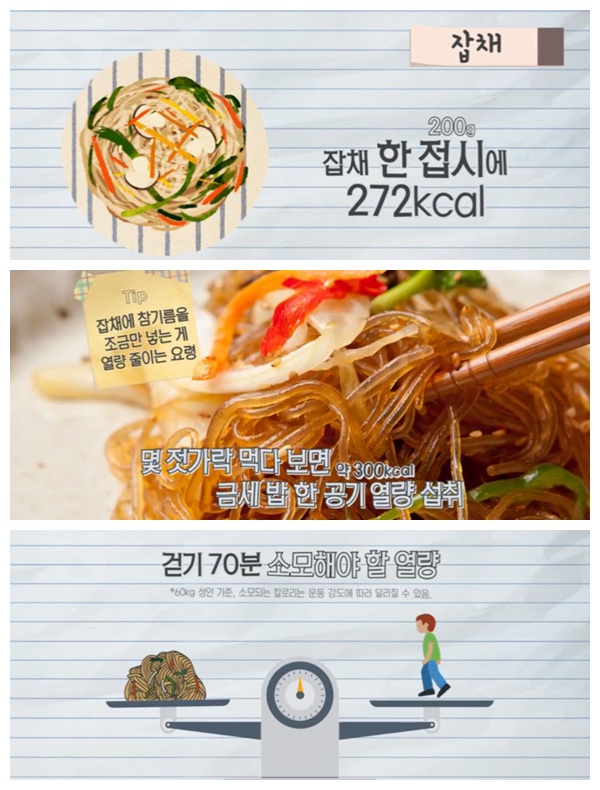 韓式炒雜菜是一道各色蔬菜、粉條加上肉絲的混合炒菜,200克的炒雜菜熱量為272卡路里,幾口下肚,相當于吃了一碗白米飯,散步1小時才能抵消掉幾口的熱量。溫馨小提示:炒雜菜快要出爐時,少放些香油可以減少攝取更多的熱量。值得一提的是,炒雜菜所用的蔬菜不能水分太大,西葫蘆、黃瓜等只用外皮,里面的果肉是要去掉的。