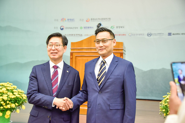 忠清南道道知事梁承晁(左)與孔子第79代嫡孫孔垂長奉祀官握手。