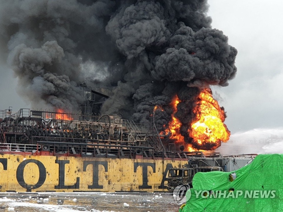 當地時間28日上午,韓國南部蔚山港一艘油輪發生爆炸。圖片來源:韓聯社