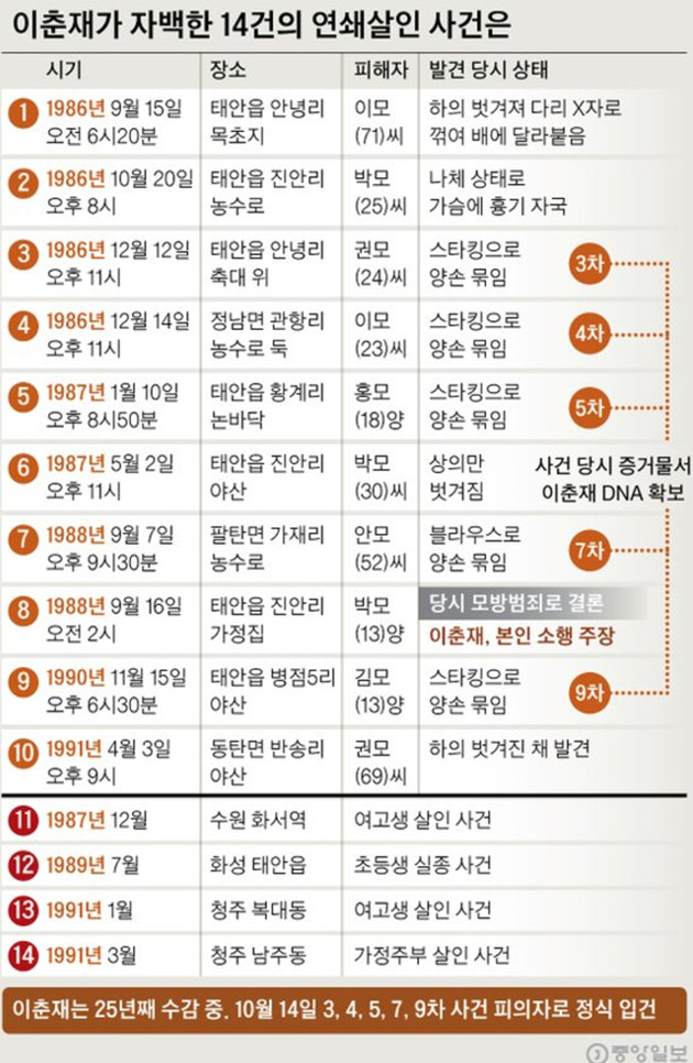 李春載承認的14起謀殺案件 圖源:《中央日報》報道截圖