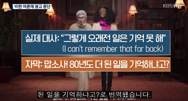 據韓國KBS電視臺10月21日報道,受到爭議的廣告中,90多歲的老太太與10多歲的少女兩人之間對話的韓文翻譯令韓國民眾惱火。少女提問老太太“在我這個年紀時,您怎么穿衣服”,老太太回答“我不記得這么久遠的事情了(I can't remember that far back)”,而這句的韓文翻譯是“天吶!80多年前的事情怎么還會記得”。80多年前正是韓國的日本殖民統治時期,許多韓國女性不幸淪為日軍“慰安婦”。韓國民眾質疑這是在侮辱“慰安婦”受害者。
