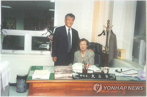 文在寅在法律事務所工作時期與母親姜韓玉的合影。