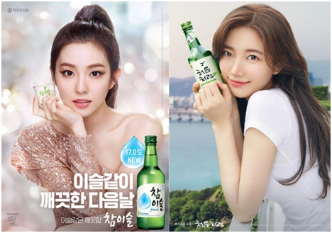 報道稱,韓國大部分的燒酒品牌都會聘請韓國女星當代言人。如下圖所示,左邊某品牌燒酒代言人是韓國當下最火女團之一的Red Velvt成員裴珠泫。右邊某品牌燒酒代言人是韓國一線女星裴秀智。