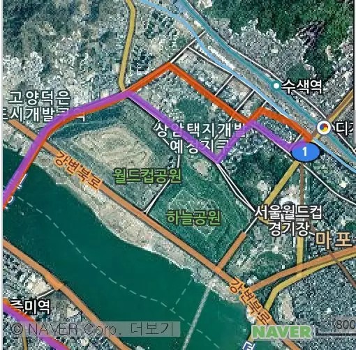 仔細看韓國公交車行程圖時,就會發現某些公交車去程和回程部分路線是不一致的。例如,圖中的紫色線和橘黃色線是同一路公交車的往返路線,但所經過的站點是不完全一致的。
