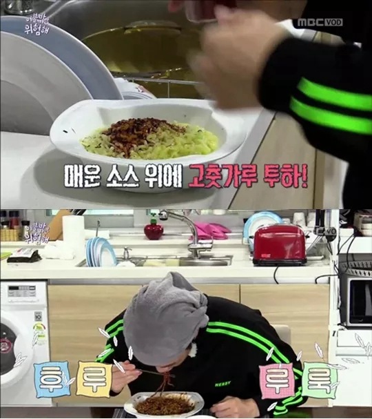 姜丹尼爾也在節目中展示過自己的煮面實力,姜丹尼爾將火雞面和炸醬面一起煮,最后放入調料,又咸又辣。