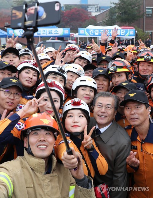 2017年11月3日,文在寅在忠南天安市中央消防學校舉行的消防日紀念活動上,與消防員們合影留念。(圖片來源:韓聯社)