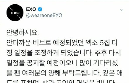 人民網訊 據韓媒,EXO官方發布回歸延期聲明稱,“因為令人遺憾的噩耗,EXO正規6輯預告發布日程將進行變更。我們將在之后另行公布日程,希望等待的粉絲們予以諒解。在此表達我們深深的哀悼,為故人祈求冥福!