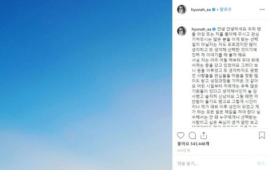 就像身體不舒服的話會吃藥和感冒了要吃感冒藥一樣,一直很堅強的我無法相信自己得了憂郁癥和恐慌障礙。一年時間里我都不相信,但是現在很自然地堅持兩周接受一次治療。其實我沒覺得很糟,因為很多人陪著我,但是第一次視野模糊暈倒后,大家都說這是恐慌障礙的癥狀。根據醫生建議,在大學醫院做腦電波等種種檢查后才知道,原來我患有迷走神經性昏厥。我整個人都懵了。我很想站在舞臺上,但如果我這么頻繁地暈倒的話,誰會愿意找我呢?我首先考慮到了這個,所以不想告訴任何人。雖然我的秘密一直都不被發現挺好,但每次暈倒時我都會感到內疚,每次在拍攝廣告畫報或者有行程的時候,我都會對那些相信我的人感到抱歉。所以我想稍微輕松一點,就這么坦白地說出來了。雖然很擔心,但是沒有隱瞞鼓起勇氣說出來了。雖然以后也會努力活得像現在這樣勇敢,但是我覺得人無完人,想以后像現在這樣鼓起勇氣誠實生活,愛著并照顧好自己。謝謝你們的閱讀。