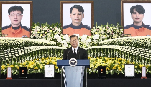 文在寅在致悼詞時表示,5位消防隊員飛越大海,救助國民,他們崇高的精神令人贊賞。國家為守護國民生命與安全而存在,對于等候消防員救助的國民來說,就是在等候國家救助他們。殉職的消防員未辜負國民對他們的信任。