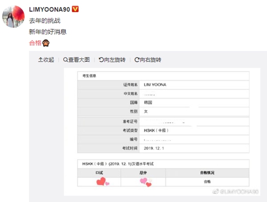 人民網訊 1月6日下午,韓國歌手、演員兼主持人林允兒在微博分享了一張自己漢語水平口語考試(HSKK)合格的成績單,并配文:“去年的挑戰,新年的好消息,合格!