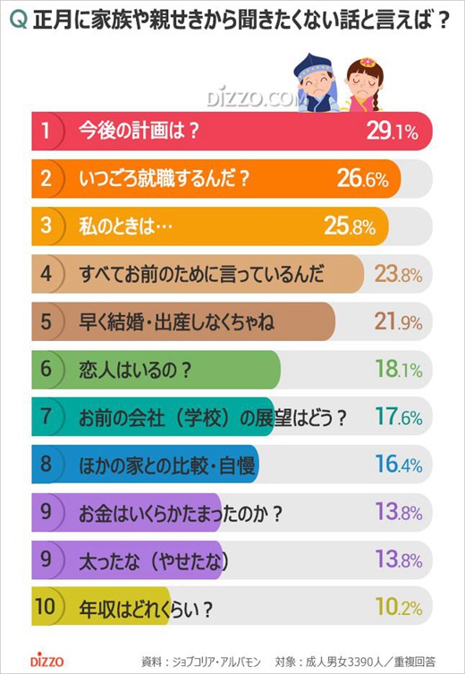 特別是大學生、應屆畢業生和上班族等,每個群體都有不想聽到的提問和話題。最近,調查機構DIZZO以韓國3390名受訪者為對象,詢問了他們在過年期間最不想聽到親戚和朋友問的問題,結果如下: