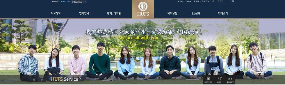 海外網發現,該標語出現在韓國外大官網首屏位置,背景是11名坐在草地上微笑的學生。標語用醒目的中文寫道,“我們都是韓國外大的學生。武漢加油,中國加油!”下方,是一句表達支持的英文“We are all with you”。