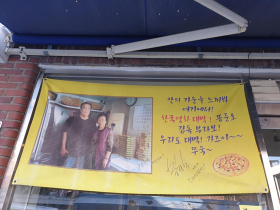在電影中主人公一家人打工折披薩包裝盒的首爾銅雀區的披薩店前,掛著奉俊昊導演的簽名和橫幅。