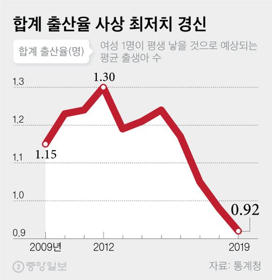 韓國統計廳26日發布的“2019年人口動向調查報告”顯示,2019年韓國的總和生育率為0.92人,是自1970年有出生統計以來的最低記錄。2019年新生兒數為30.31萬人,減少了2.37萬名,同比降低7.3%。韓國的生育率從1971年的頂峰4.54人,降至1987年的1.53人,1990年代初期暫時增至1.7人,但是此后再次迅速減少,到2018年降至0.98人,首次跌破1人。經合組織認為,正常的總生育率為2.1人,超低出生率為1.3人,經合組織成員國的平均數為1.56人,而韓國2019年的生育率,與這些指標均有較大的距離。統計廳工作人員稱:“經合組織國家中總合生育率有過不到1.3名記錄的國家只有韓國、葡萄牙、波蘭!