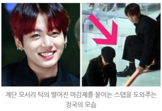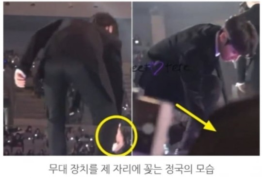 視頻中,在防彈少年團的公演結束后,離舞臺有一段距離的田征國拿著地上的兩個鼓和棍棒交給了現場工作人員。之后,他環顧了一下四周是否清理干凈。確認后,怔國拿起獎杯,給工作人員遞了一束花,道了聲“辛苦”后離開現場。