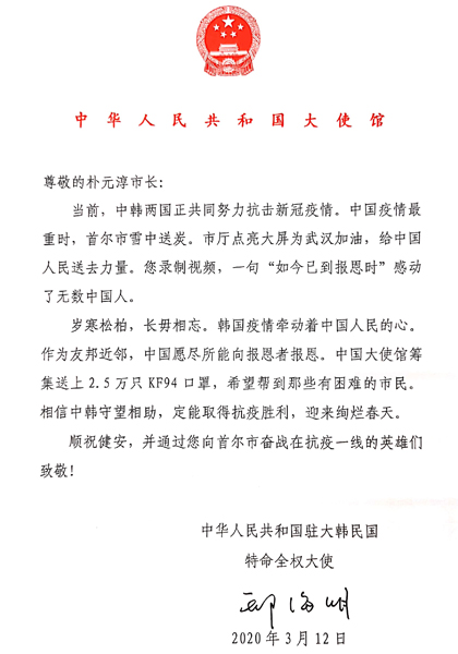 邢海明大使致信樸元淳市長表示,中國疫情最重時,首爾市雪中送炭。市廳點亮大屏為武漢加油,給中國人民送去力量。樸市長錄制視頻,一句“如今已到報恩時”感動了無數中國人。歲寒松柏,長毋相忘。韓國疫情牽動著中國人民的心。作為友邦近鄰,中國愿盡所能向報恩者報恩。相信中韓守望相助,定能取得抗疫勝利,迎來絢爛春天。