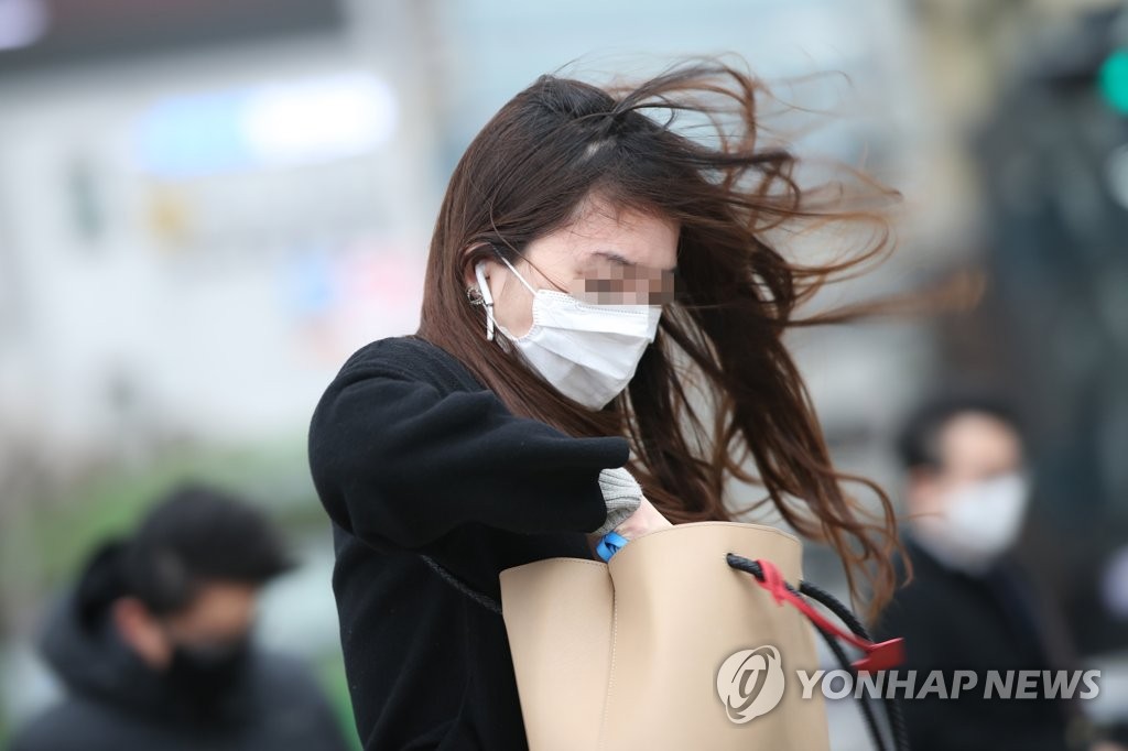 3月19日,在首爾光化門一帶,市民頂風出行。 (圖片來源:韓聯社)