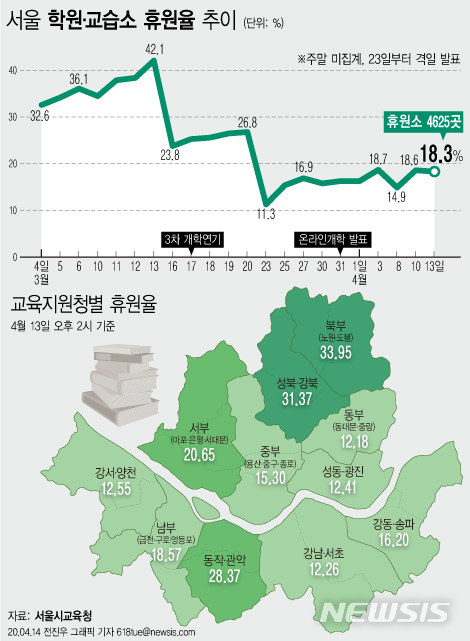 截至4月13日下午2時,首爾市教育廳所管轄的補習班停業現狀顯示,25231家登記在案的補習班僅有4625家關門。該日首爾補習班停業率為18.3%,與10日相比減少了0.3個百分點。停業的補習班數量減少了70家。