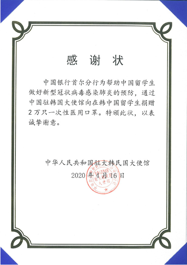 黃德行長表示:“疫情無情,祖國有愛!中國銀行作為第一家進入韓國的中資銀行,將積極承擔社會責任,為在韓華人提供力所能及的幫助。捐贈的2萬只口罩,不僅僅是中國銀行的情誼,還傳遞了祖國和親人的牽掛。同學們在外求學不易,希望廣大在韓學子注意安全,做好自身防護,中國銀行也將繼續為留學生做好金融服務與支持,愿與你們攜手并肩,共渡難關!”