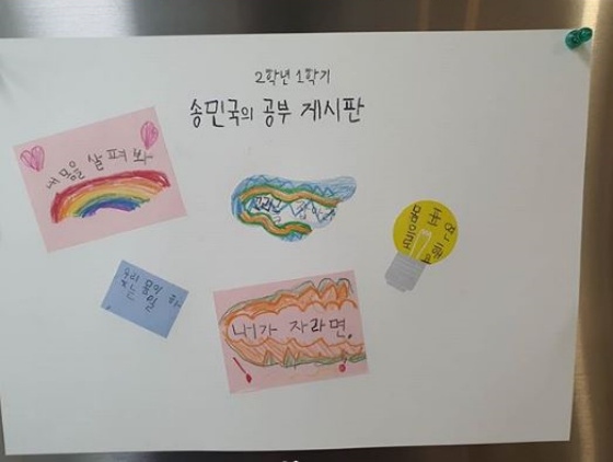 在公開的照片中,宋一國的兒子大韓、民國、萬歲身穿同款藍色T恤并排而坐,觀看投影儀畫面的EBS講座。