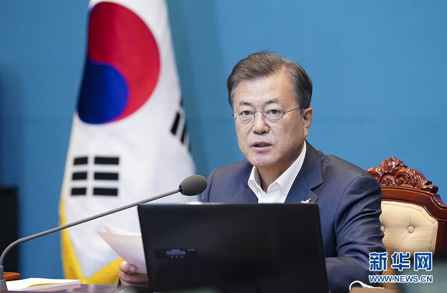 4月27日,韓國總統文在寅在首爾青瓦臺主持會議。 在韓朝兩國領導人舉行板門店會晤并簽署《板門店宣言》兩周年之際,韓國總統文在寅27日呼吁韓朝兩國共同抗擊新冠疫情,并以此為起點進一步積極展開交流合作。為紀念《板門店宣言》簽署兩周年,韓國統一部長官金煉鐵和國土交通部長官金賢美當天出席在江原道高城郡豬津驛車站舉行的促進東海北部鐵路線建設紀念儀式。東海北部線江陵至豬津驛段鐵路目前處于斷開狀態,韓國政府于4月23日將這一鐵路項目指定為南北交流合作項目。 新華社發(青瓦臺供圖)