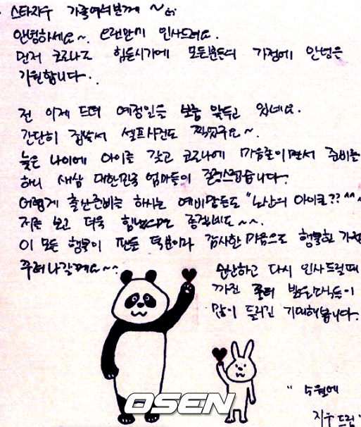 崔智友在信中寫道:“首先為因新冠疫情正在度過困難時期的人們的家庭而祈禱。我現在終于即將迎來預產期了,希望正在準備生育的準媽媽們看到作為高齡產婦的我,可以更加努力!