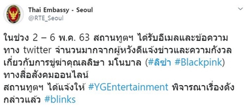 對此,駐韓泰國大使館已將Lisa遭受人身威脅的相關內容告知其經紀公司YG娛樂。YG娛樂表示,已采取措施保護旗下藝人和粉絲的安全,除了實時監控外,還將通過粉絲的舉報等收集證據,將予以強硬應對。