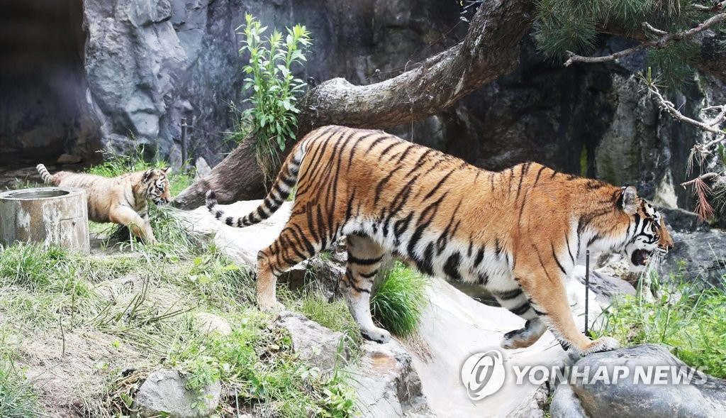 21日上午,在京畿道龍仁市愛寶樂園,虎寶寶跟著媽媽的步伐前進。