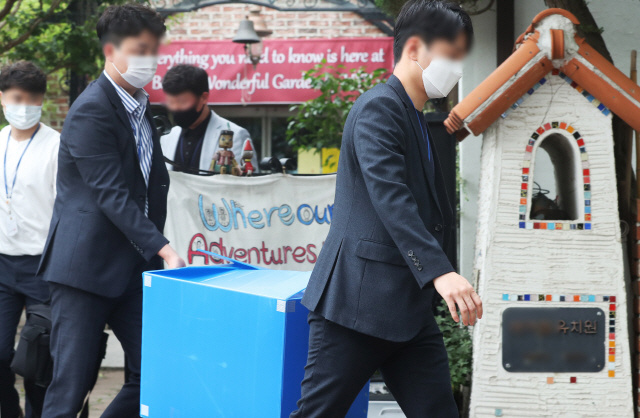 29日,在事發幼兒園,警方正在將裝有幼兒園提供的監控資料箱子轉移到車上。