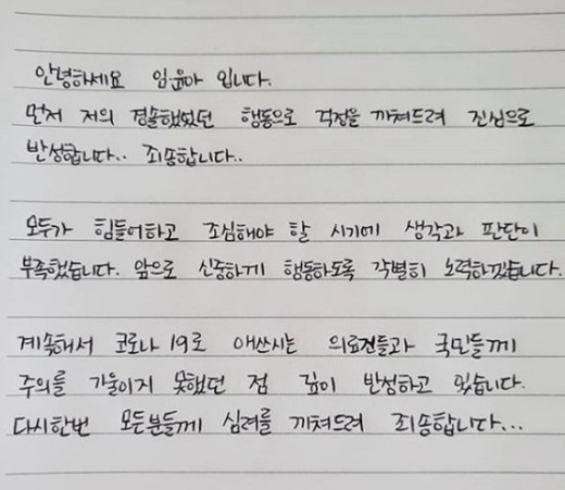 7月2日,林允兒繼李孝利之后進行公開道歉。林允兒在自己的社交賬號上留言,對自己本次輕率的行為表示抱歉。允兒在手寫道歉信中表示,今后會謹言慎行,正在進行深刻反省。