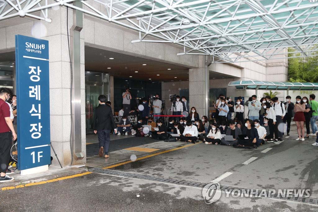 7月10日上午,在位于首爾市鐘路區的首爾大學醫院殯儀館前,各家媒體記者嚴陣以待。首爾市長樸元淳的靈堂設在首爾大學醫院。 圖源:韓聯社