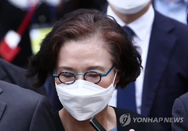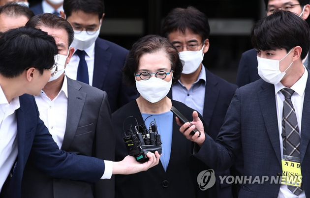 7月14日下午,在位于首爾市瑞草區的中央地方法院,李明姬走出法庭。圖源:韓聯社