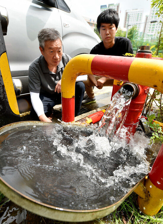 去年紅色自來水事件發生后,韓國相關工作人員正在實行自來水排空措施。(圖源:韓聯社)