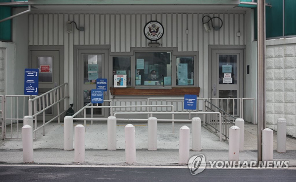3月19日,美國駐韓大使館前門庭冷落。 圖源:韓聯社