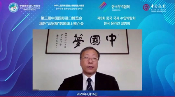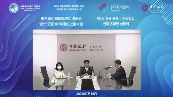 人民網訊 7月16日,在中國國際進口博覽局、中國駐韓國大使館經商處、韓國貿易協會的支持下,中國銀行首爾分行通過線上方式,成功舉辦第三屆進口博覽會“境外云招商”推介會。
