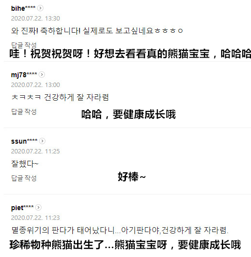 大熊貓產子喜訊公開后,韓國網友們紛紛評論“好可愛,要健康成長哦”,“祝賀祝賀”,表達對幼崽的喜愛和祝福。據悉,該幼崽是在韓國本土通過自然繁殖出生的首只大熊貓。