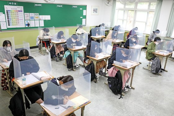 大邱女子高中高三年級的教室,高三學生正在設有隔離板的考場內進行模擬考試。 圖源:news1