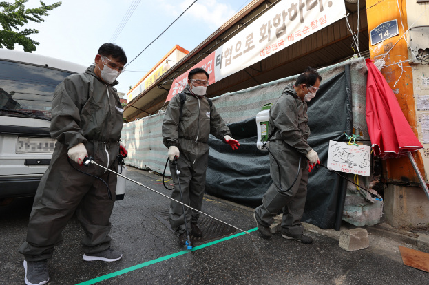 17日下午,在“愛第一教會”附近,相關工作人員正在進行消毒作業。圖源:韓聯社