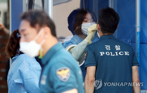 8月19日,在首爾地方警察廳機動本部的篩查點,曾維持光復節集會秩序的警員接受新冠病毒檢測。 圖源:韓聯社
