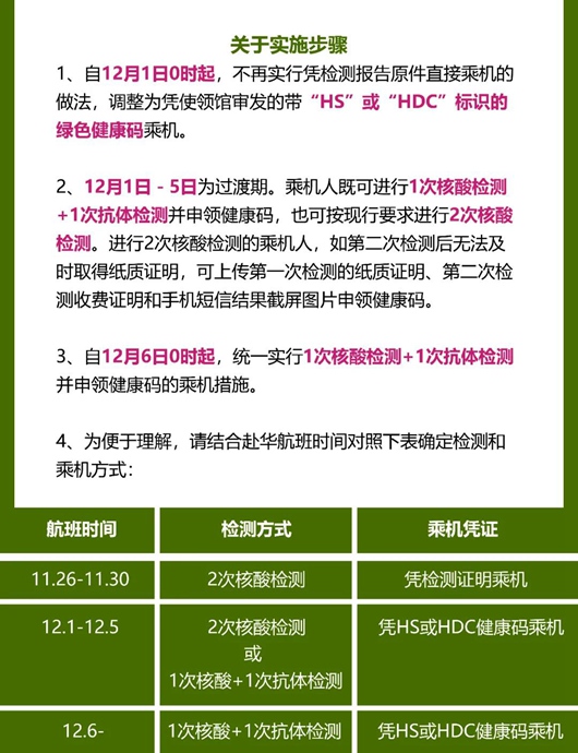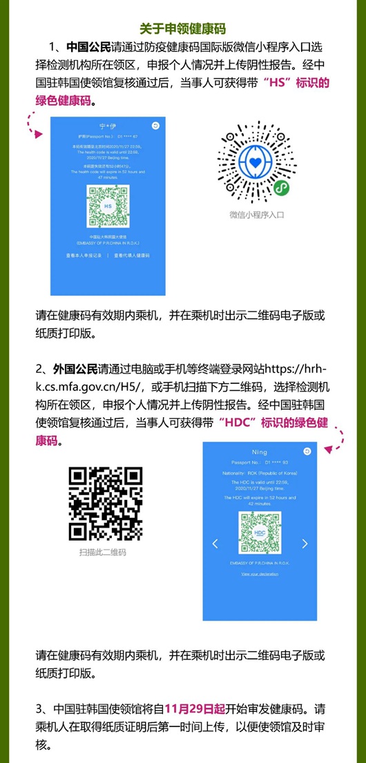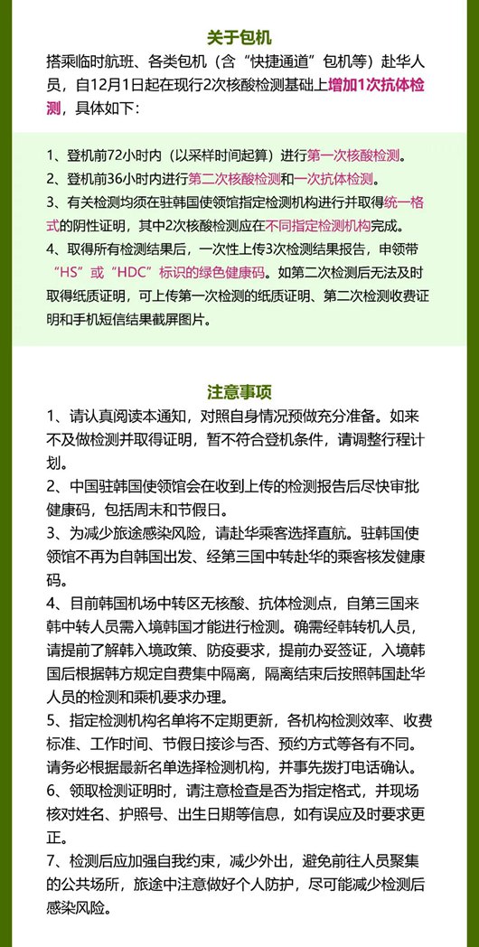 人民網訊 11月26日,駐韓國大使館微信公眾號發布《關于12月1日起在韓國實施赴華人員憑新冠病毒核酸檢測及血清抗體檢測雙陰性證明乘機的通知》,具體內容如下: