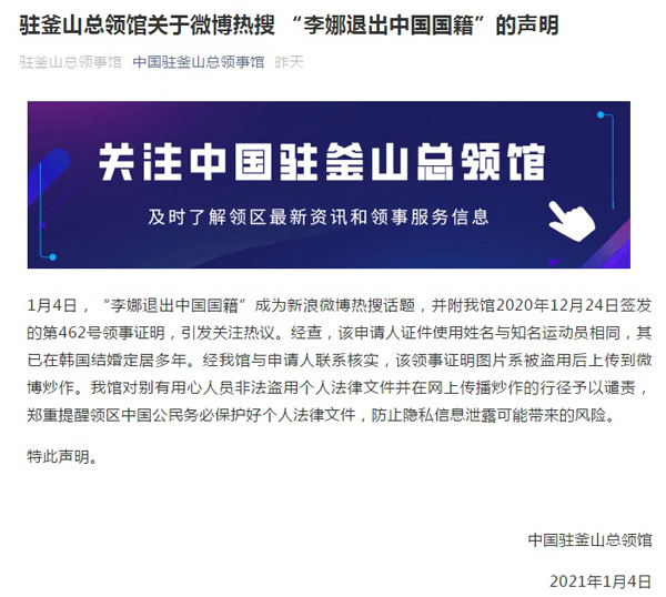 1月4日,“李娜退出中國國籍”成為新浪微博熱搜話題,并附我館2020年12月24日簽發的第462號領事證明,引發關注熱議。經查,該申請人證件使用姓名與知名運動員相同,其已在韓國結婚定居多年。經我館與申請人聯系核實,該領事證明圖片系被盜用后上傳到微博炒作。我館對別有用心人員非法盜用個人法律文件并在網上傳播炒作的行徑予以譴責,鄭重提醒領區中國公民務必保護好個人法律文件,防止隱私信息泄露可能帶來的風險。