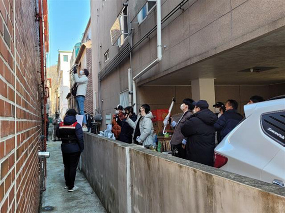 趙斗淳出獄當天,在其家門口直播的自媒體從業人員。圖源:首爾新聞